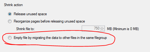 9. I repeatedly tried to drop the 2nd Log file and repeatedly got a “file not empty” message. I then noticed this little setting in the SHRINK FILE screen.ShrinkFile Scripting it out I discovered this. Wow, learn something new everyday.  Executing this statement moved what little transactions were left in the 2nd Log file to the Main log file so I could remove the file without any problems.