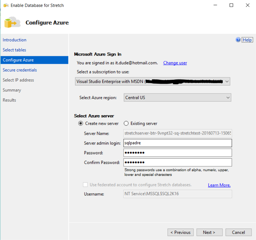 This will launch the “Enable Stretch Wizard.  First step in the wizard is the the Introduction.  First thing I noticed was the the statement: “Once the data is migrated to Azure, unique and primary keys will not be enforced on Azure”  Really?  I wonder what else will be “not enforced” or not compatible with Azure.  Time to look up my friendly neighborhood BOL, Limitations for Stretch Database. Wow, that’s a good number of limitations; however this is a simple test so I am not worried.