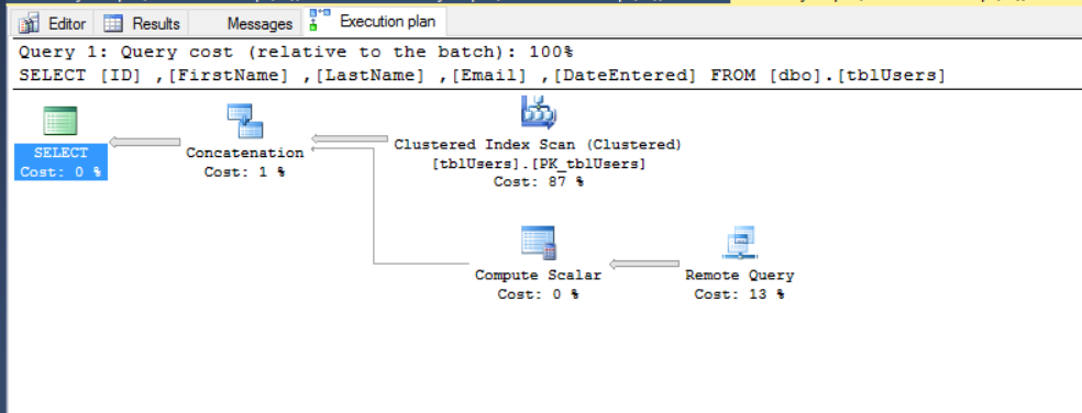 and 4287 rows found in the local database.  Exactly what I expected.  Again, the query execution plan has to use “Remote Query”  and Concatenate the results to produce the desired results.