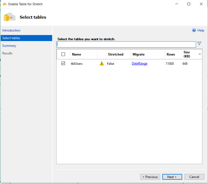 After the tblUsers table was populated, I enabled the Stretch Table wizard by right clicking on the table and selecting STRETCH >> ENABLE.  After the Introduction screen you get to select which tables you would like to stretch to Azure.  The GUI screen shows you all the tables and if there will be any “warnings” about stretching, the option to filter, number of rows in the table and the size of the table.